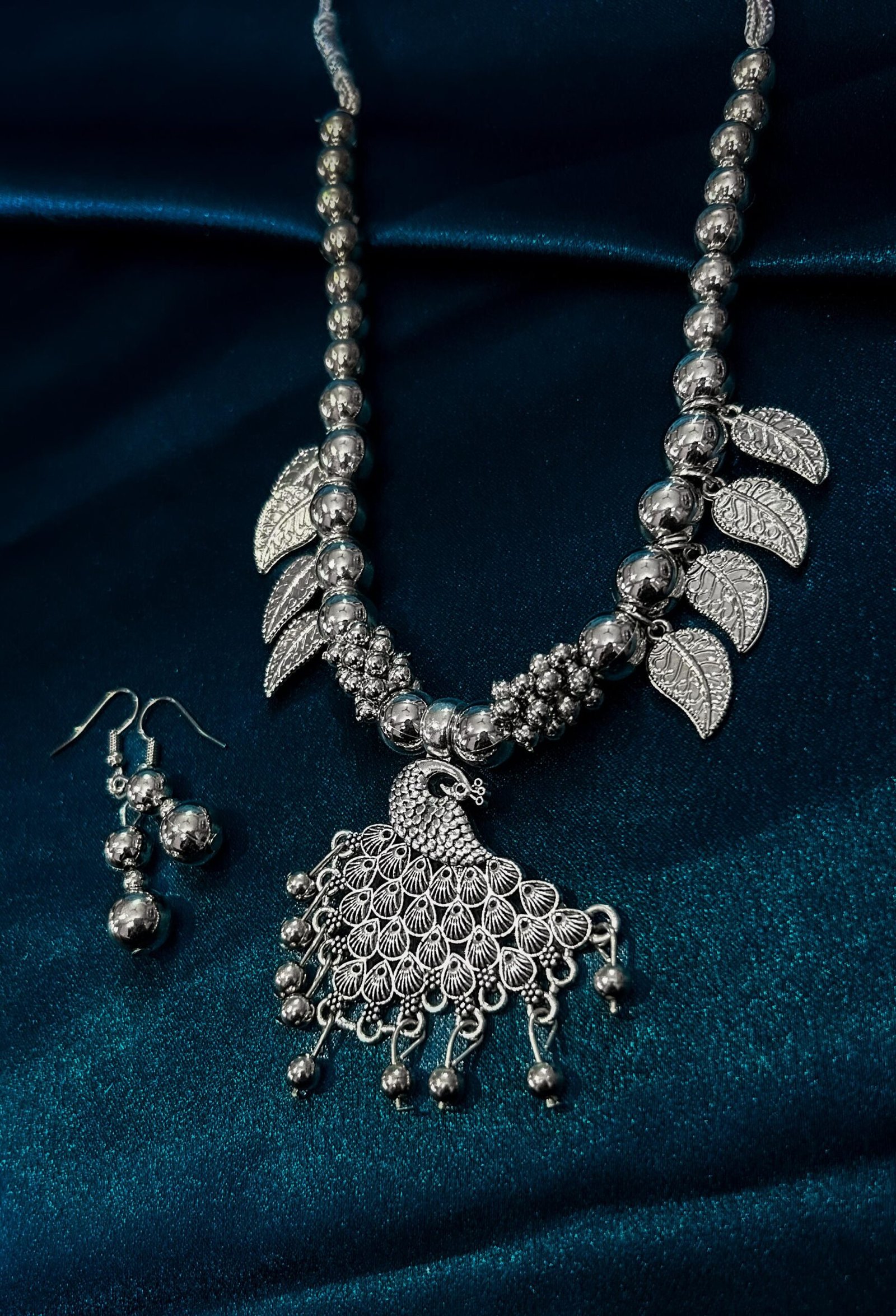 New trending oxidised peacock necklace with antique design. Stylish, lightweight and perfect for ethnic wear. A must-have imitation jewellery piece.