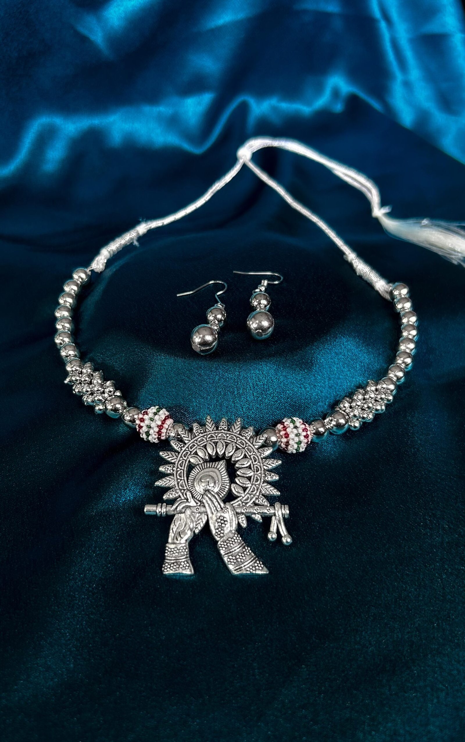 Shop Oxidised Necklace Flute Shape with antique silver finish. Stylish lightweight jewellery for ethnic, festive and traditional wear.